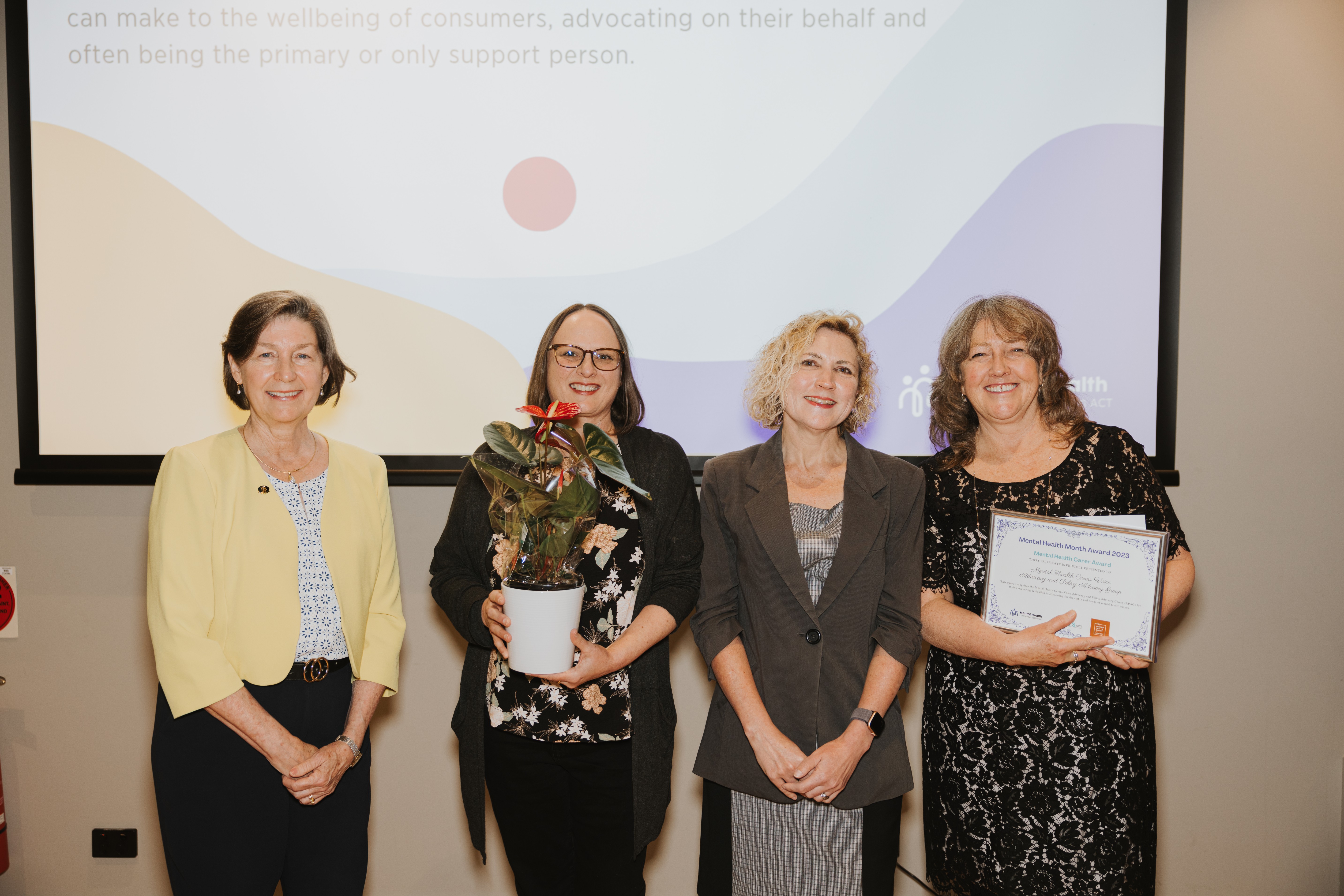 APAG win at Mental Health Month We are thrilled to announce that the Mental Health Carers Voice Advocacy and Policy Advisory Group (APAG) were one of the deserving award recipients of the Mental Health Month Awards, hosted by Mental Health Community Coalition on November 1st. This award is a testament to their tireless efforts and unwavering dedication in advocating for the rights and needs of mental health carers in the ACT.